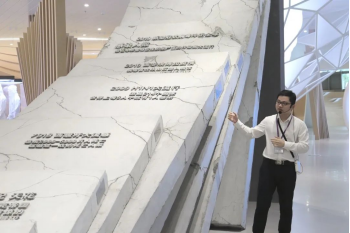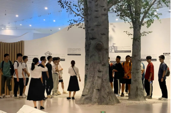 The lecturer guided the students through the exhibition hall, where displayed people’s gratitude voices from different countries around the world towards China's anti-epidemic actions. In the exhibition hall, there was a domino display area made of collapsed walls, symbolizing the heavy impact of the epidemic on human beings, with each domino representing a hazard, and the task of human beings is to rebuild, step by step, for the health and safety of all of us. Next to the scene, there was a hollowed-out tree with a headphone hanging from a dried out branch. Students can listen to the real voices of patients who suffered from the disease during the epidemic by putting on the headphone.