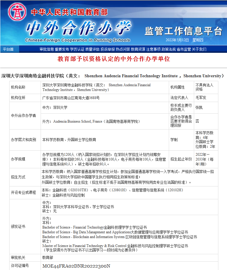 为响应国家对于打造粤港澳大湾区以及中国特色社会主义先行示范区的号召,切实做好“双区”人才培育工作,深圳大学努力探索金融科技学科建设,积极与金融科技领军企业-微众银行探索产学研一体化发展,形成了一流的金融科技人才培养高地。在此基础上,深圳大学积极开展国际学术交流合作,引入国际化元素,联手欧洲顶级商学院之一的法国南特高等商学院向教育部申请合作办学项目。两校首个联合打造的金融科技与风险控制中外合作办学硕士项目于2019年通过审批。2022年,中法两校及微众三方共同努力,进一步申请共建非独立法人中外合作办学机构——深圳大学深圳南特金融科技学院(Shenzhen Audencia Financial Technology Institute, Shenzhen University,简称SAFTI),该机构于2022年4月正式获得教育部批准(https://www.crs.jsj.edu.cn/aproval/detail/3145)。深大南特金融科技学院将在深圳大学微众金融科技学院的基础上整合优化,开展相关培养。