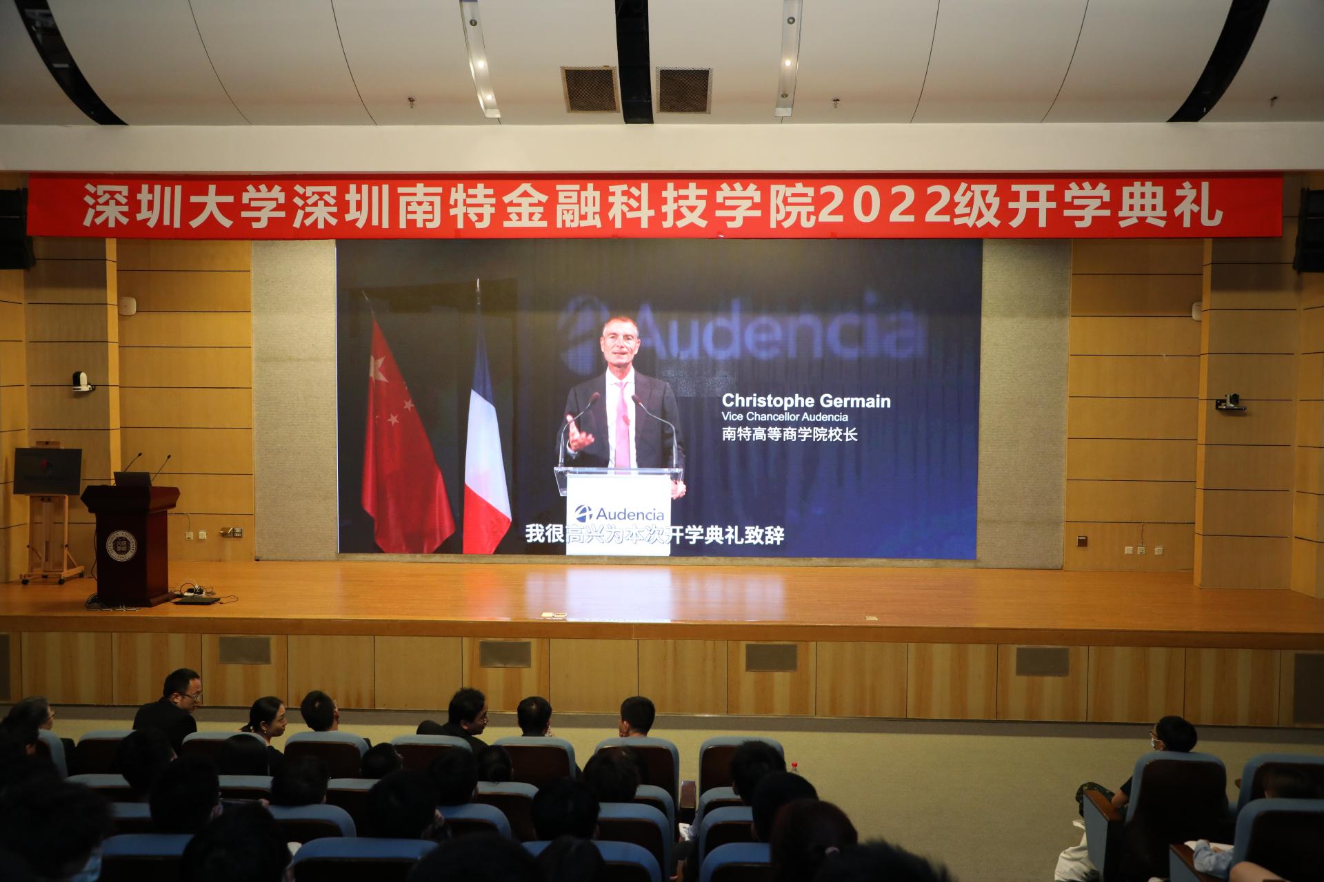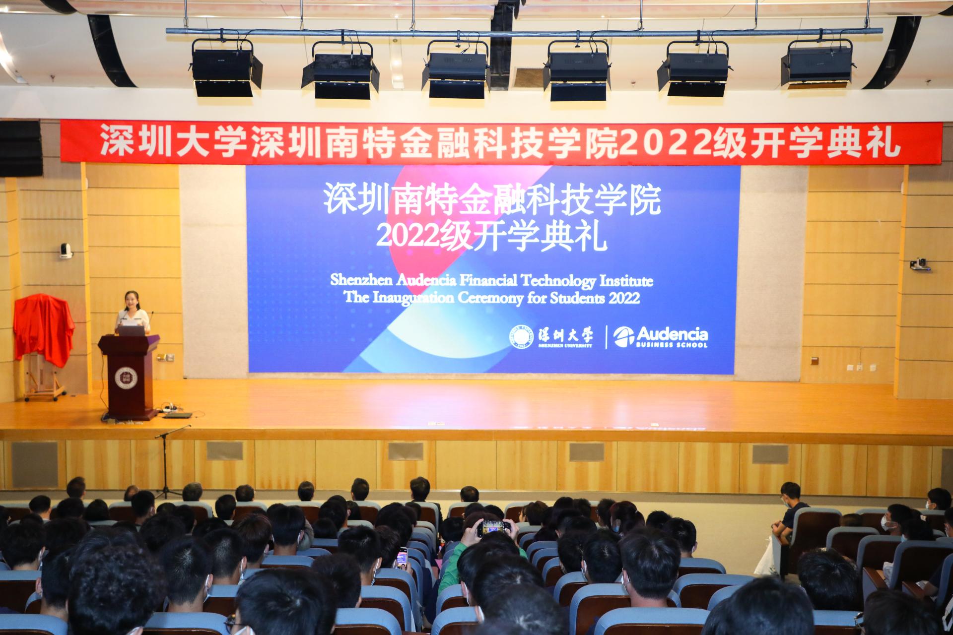 筑梦新起点,启航新征程。9月20日下午,深圳大学深圳南特金融科技学院2022级新生开学典礼在汇星楼一号报告厅顺利举行。校党委常委杜宏彪副校长、国际交流与合作部韩水仙主任以及学院班子成员、教师代表出席,260名本科新生和94名金融科技与风险控制专业硕士学生参加了自中外合作办学机构获批成立以来的首场开学典礼。