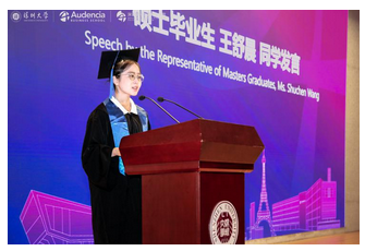 硕士优秀毕业生代表王舒晨在会上分享了学习收获。她说,在过去的两年里,我们在学习中提高了素养,获得了技能。财务会计告诉我们努力奋斗的重要性,机器学习启发了我们如何工作,衍生品涉及杠杆思维,强调了从外部获取力量的重要性。我们学会了在面对失败时不要放弃,学会了需要控制风险并坚守底线。她向学院和老师们表示最深切的感谢,感谢引导同学们走向金融科技的前沿。