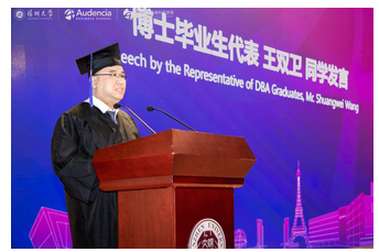 DBA项目毕业生代表王双卫在发言中表示,通过这几年学院导师的悉心指导,通过对企业管理知识的学习,让他深刻的理解了企业管理的内涵。他将继续学习并开展相关方面的工作实践,希望为中国中小企业健康发展的理论研究贡献一份力量。