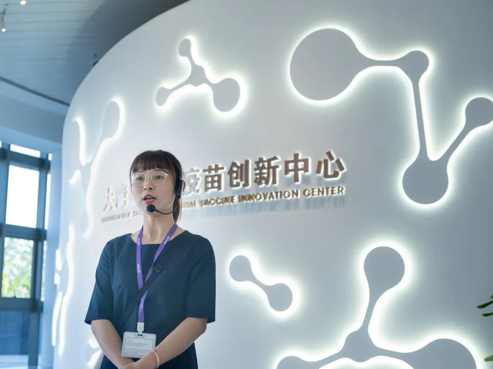 讲解员引导同学们参观疫苗创新中心的展厅,展厅内播放着来自世界各地不同国家的人们对中国防疫行动的感激之意与感动之情。展厅尽头的立方体投影屏幕,播放着中国抗疫逆袭的壮丽史诗与仍潜伏的危机。展厅中有一个由倒塌的乱墙堆砌而成的多米诺骨牌展示区,这个场景象征着疫情对人类的沉重打击,每一块骨牌都代表着危害,而人类的任务是重建,一步一步为大家的健康安全努力。在一棵被凿空的树旁,干瘪的树枝上挂了只耳机,戴上耳机,可以聆听到那些疫情中饱受病痛折磨的患者们真实的声音。展厅述说着人类悠久的面对各种疾病的防疫历史,展示了当代科技如何应对疫情挑战,展望了一个美好、幸福、健康的未来。在这里,同学们看到了科技创新的力量,感受到生命的可贵和人类的无限希望。