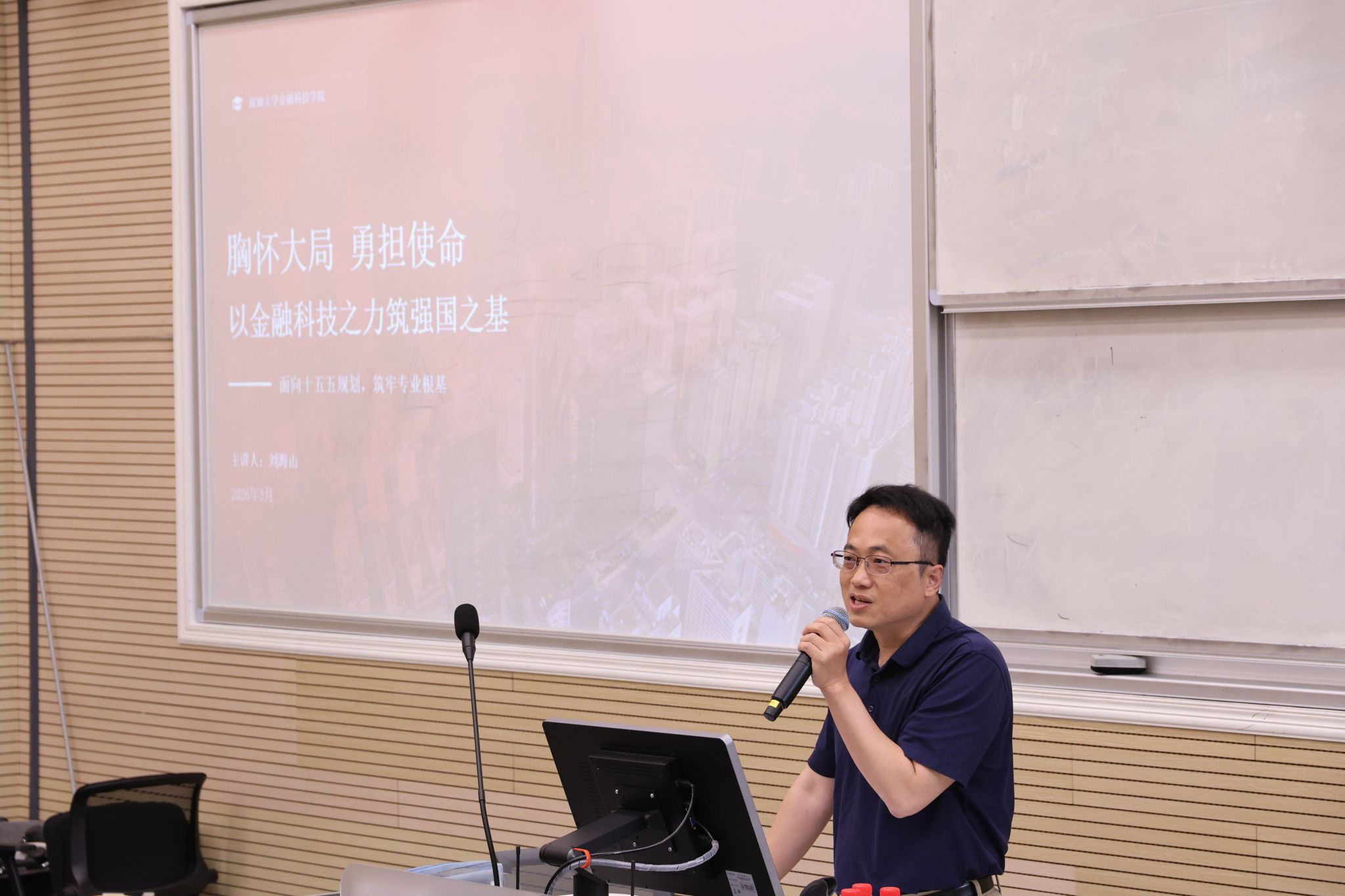 刘海山指出专业学习要紧扣服务实体经济、防控金融风险、发展数字经济的使命任务。他对金科学子提出四点素养期望:一是锤炼忠诚品格,坚定理想信念;二是练就过硬本领,夯实专业基础;三是培养创新创造能力,敢为人先;四是坚守底线操守,恪守职业道德。立足深圳“20+8”产业集群发展机遇与全球人工智能先锋城市定位,刘海山强调金融科技要服务实体经济,更好发挥金融科技的专业力量。以深圳即将召开的APEC会议为契机,争做城市代言人,积极参与开放交流与创新实践,将课题研究、社会实践与海外升学、职业发展相结合,在实干中成长成才,在服务地方经济发展中彰显专业价值。讲好深圳故事、展现青年担当,在粤港澳大湾区建设中贡献青春力量。