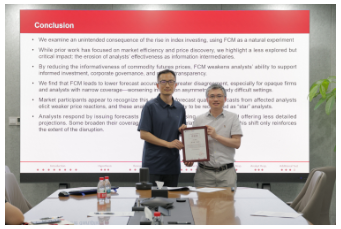 本次讲座中,陈旸旸教授介绍了其最新研究论文。目前被动指数投资的快速扩张已经改变了金融市场,但其更广泛的影响仍未得到充分研究。研究揭示了一个关键但未被充分探讨的现象:金融分析师作为有效信息中介的能力在减弱。利用大宗商品市场金融化(FCM)作为自然实验,考察指数投资(在很大程度上外生于公司和分析师)的急剧激增如何影响分析师履行其信息中介角色的能力。研究发现,在FCM之后,分析师预测准确性下降,预测分歧增加,这种现象在不透明的公司以及行业覆盖范围狭窄的分析师中尤为明显。投资者似乎意识到了这种恶化:市场对预测修正的反应减弱,受影响的分析师更不可能被机构投资者评为明星分析师。作为对公共信息缺失的应对,分析师发布预测的延迟时间更长、修订预测的频率更高、提供的预测细节更少,并扩大覆盖范围以纳入经济上相关联的公司。研究结果表明,被动投资削弱了基本面信息从金融分析师向市场的传递,加剧了信息不对称,并削弱了分析师传统的监督作用。