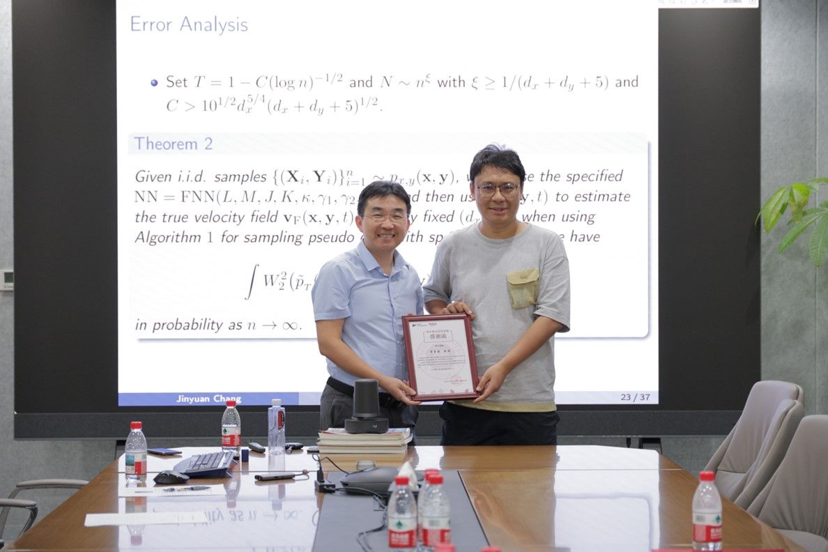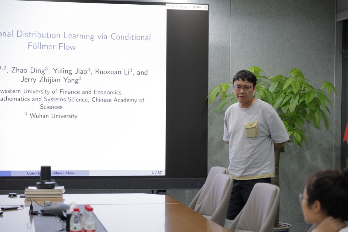 本次讲座中,常晋源教授介绍了其最新研究论文。研究提出一种基于常微分方程(ODE)的深度生成方法——条件福尔默流,用于学习条件分布。该方法从标准高斯分布出发,在时间趋近于1时能精准逼近目标条件分布。为实现高效计算,采用欧拉方法对流过程进行离散化处理,并通过深度神经网络非参数化估计速度场。此外,研究还建立了学习样本分布与目标条件分布之间Wasserstein-2距离的收敛性证明,首次为通过ODE流实现的条件分布学习提供了全面的端到端误差分析。数值实验表明,该方法在从标准非参数条件密度估计到图像数据处理等复杂场景中均展现出色性能,其优越性远超现有各类方法。