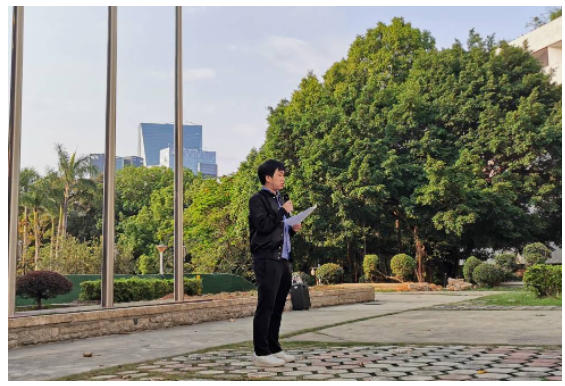 站在迎风飘扬的五星红旗下,金融科技学院22级的硕士生许斌杰同学发表了主题为《产权建设,强国有我》的演讲。在演讲中,他向大家介绍了“世界知识产权日”以及知识产权对于我国强国复兴的重要性。今天是第23个世界知识产权日,我国正从知识产权引进大国向知识产权创造大国转变,知识产权工作正从追求数量转向提高质量,我国正成为世界最重要的知识产权贡献者。最后,许同学号召深大学子们静心求学,提升能力,一起为知识产权保护、创新发展献上一份深大力量。