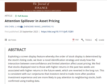 近日,我院陈鑫助理教授在金融学领域的国际顶级期刊《Journal of Finance》上发表论文“Attention Spillover in Asset Pricing”。该期刊是美国金融协会(American Finance Association)创办的期刊,也是美国德克萨斯大学达拉斯分校(University of Texas, Dallas)选出的用于评估国际商学院研究能力的24本学术期刊(简称UTD 24)之一。该论文的发表大大提升了我院在金融学及相关领域的学术影响力,也是我院高质量科研成果、高水平学科建设的重要体现。
